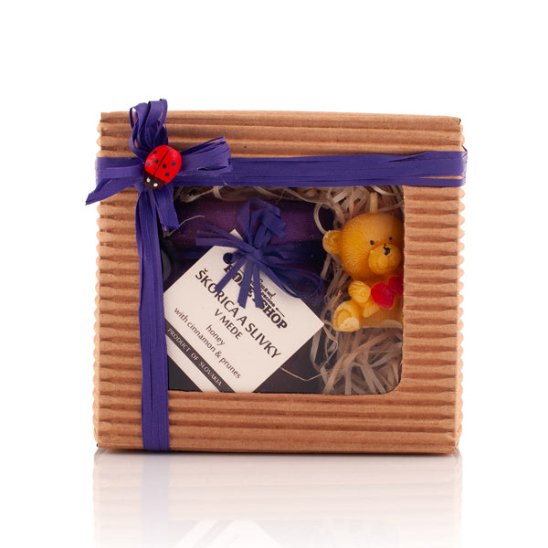 OBSAH BALÍČKA: Medová mňamka škoricovo-slivková 120g (zloženie: med 88% sušené slivky (slivky, konzervant: sorban draselný) 10 %, škorica 2%), sviečka zo včelieho vosku 7g