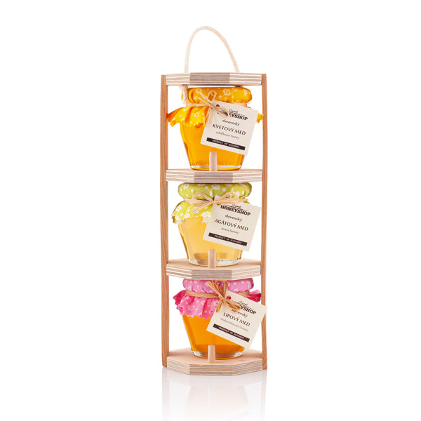 Trio medov v drevenom stojane